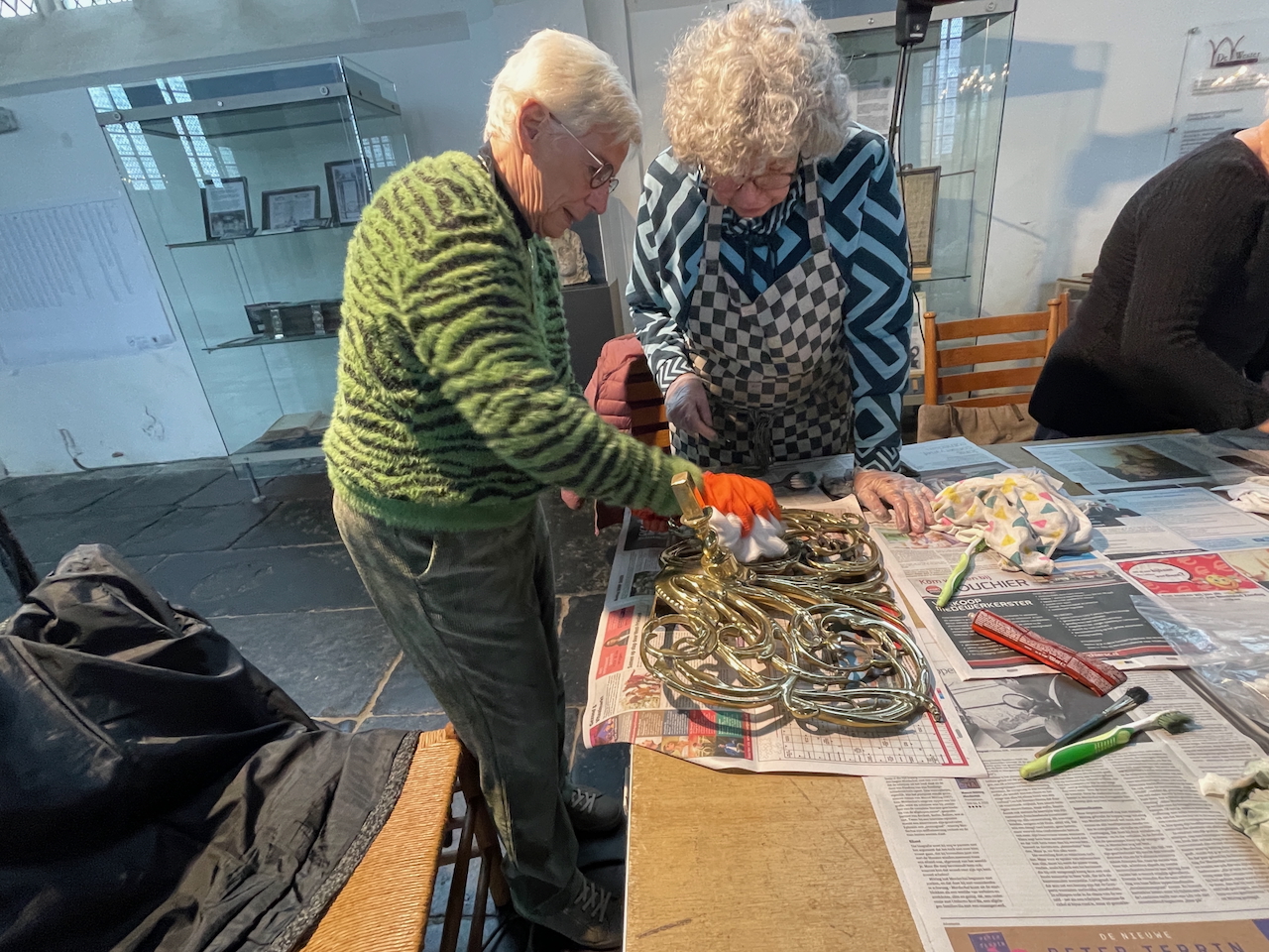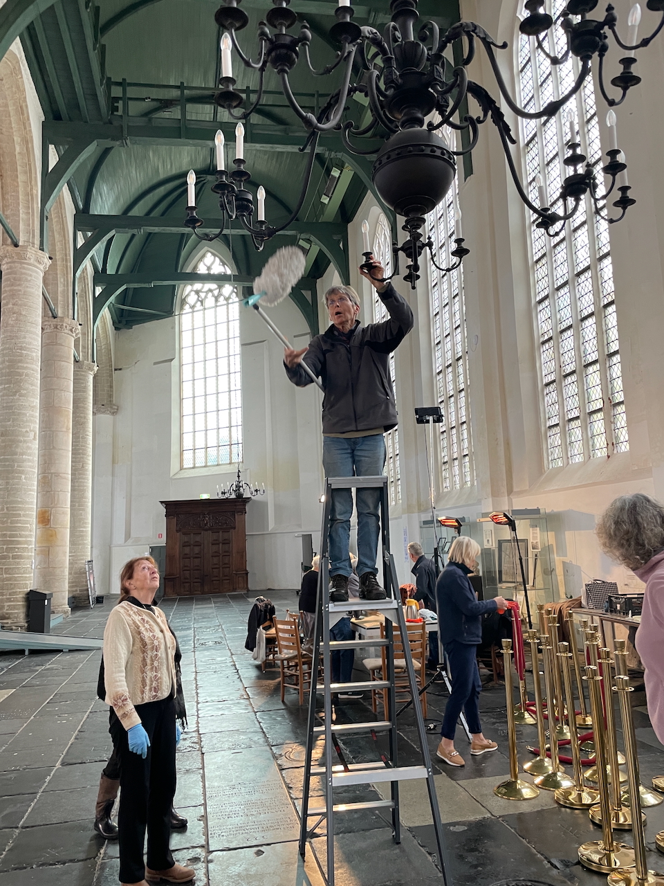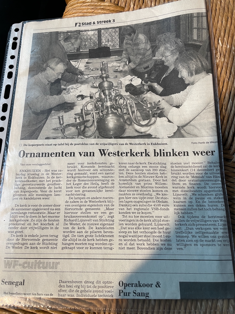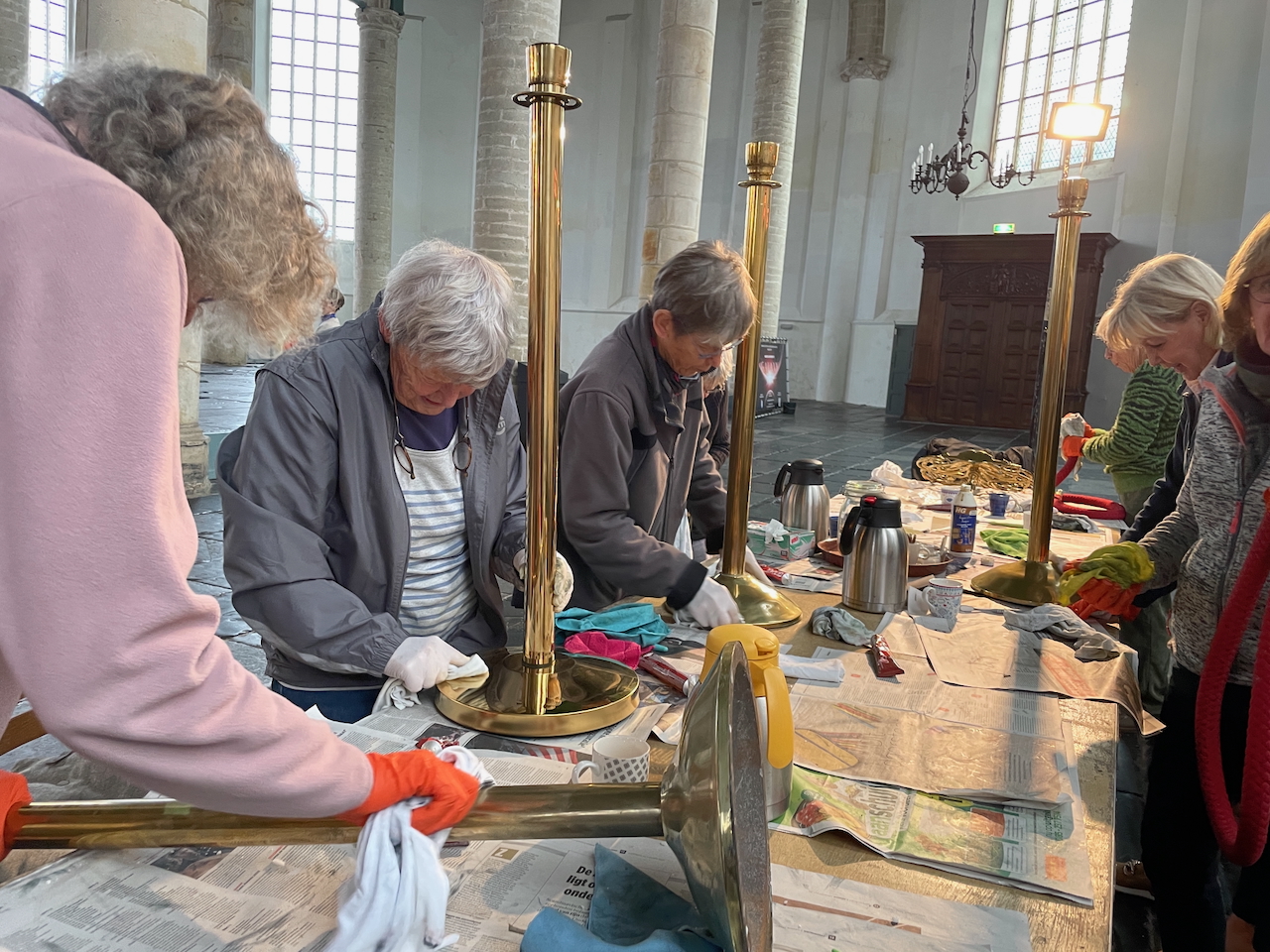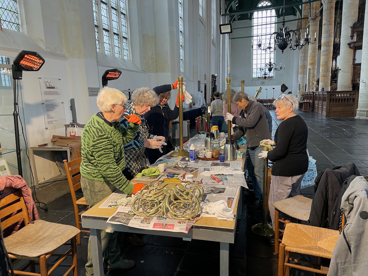Met de titel ‘Ornamenten van Westerkerk blinken weer’ vestigde het NHD in 2002 de aandacht op het harde werk van de vrijwilligers bij het poetsen van al het koper in de kerk. De Westerkerk was toen nog maar net overgedragen van de Nederlands Hervormde Gemeente aan de Stichting de Wester. Nu, 23 jaar later, was het weer tijd voor een grote oppoetsbeurt. De afgelopen jaren werd dit vooral gedaan door Hero Hoogland. Het leverde hem 2 jaar geleden nog de titel Vrijwilliger van het Jaar op. Na zijn afscheid als vrijwilliger werd het werk nu gedaan door een hele groep enthousiastelingen. En net als in 2002 blinken de ornamenten weer.